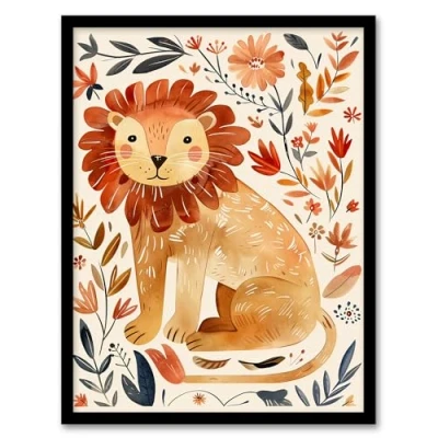 Artery8 Cute Baby Lion Rustic Floral Watercolour Kids Bedroom Nursery Artwork Framed Wall Art Print A4