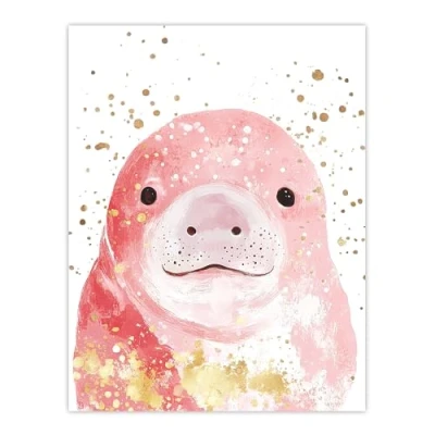 Artery8 Cute Baby Manatee Pink Gold Paint Splatter Bathroom Toilet Large Wall Art Poster Print Thick Paper 18X24 Inch