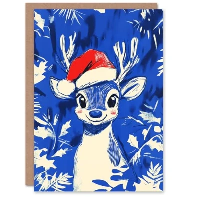 Artery8 Cute Baby Reindeer Santa Hat Holly Blue Blank For Him Or Her Art Xmas Festive Christmas Card