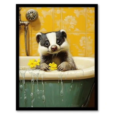 Artery8 Cute Badger in Bathtub Yellow Daisy Theme Bath Bathroom Toilet Artwork Framed Wall Art Print A4