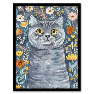 Artery8 Cute Blue British Shorthair Cat Lover Floral Pet Living Room Artwork Framed Wall Art Print A4