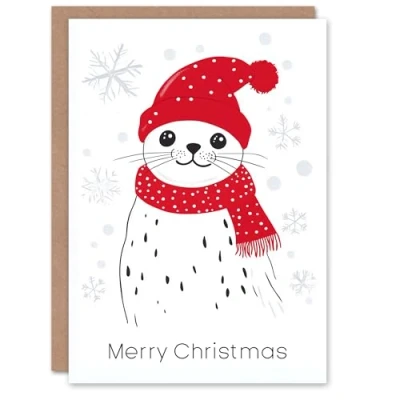Artery8 Cute Harp Seal Red Winter Hat Scarf Snowflakes Blank For Him Or Her Art Christmas Card