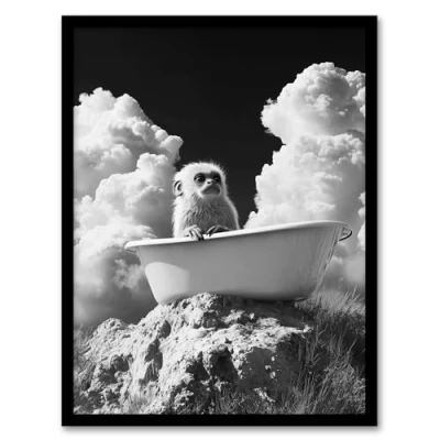 Artery8 Cute Marmoset in Bathtub Black White Surreal Bathroom Toilet Artwork Framed Wall Art Print A4