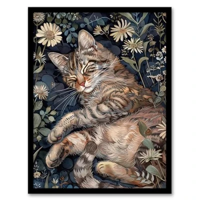 Artery8 Cute Moggie Sleeping in Daisy Field Cat Lover Living Room Artwork Framed Wall Art Print A4