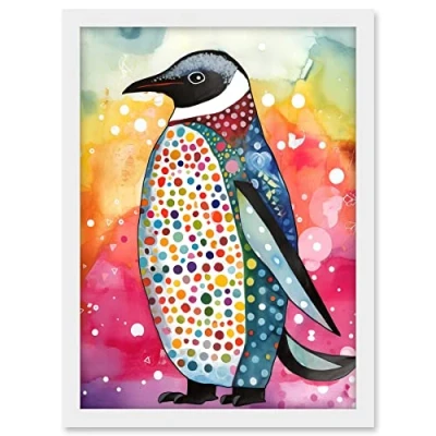 Artery8 Cute Multicoloured Spot Penguin Folk Art Artwork Framed A3 Wall Print