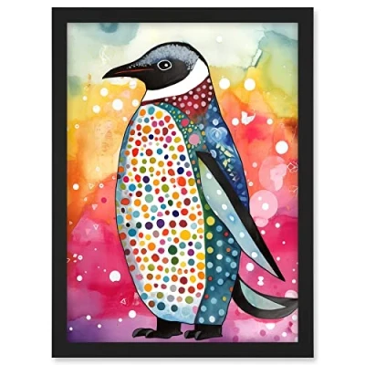 Artery8 Cute Multicoloured Spot Penguin Folk Art Artwork Framed A3 Wall Print
