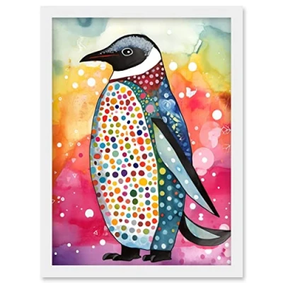 Artery8 Cute Multicoloured Spot Penguin Folk Art Artwork Framed Wall Print A4