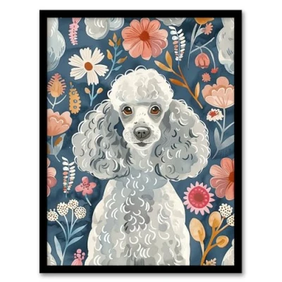 Artery8 Cute Poodle Floral Portrait Blue Pink Dog Lover Living Room Artwork Framed Wall Art Print A4