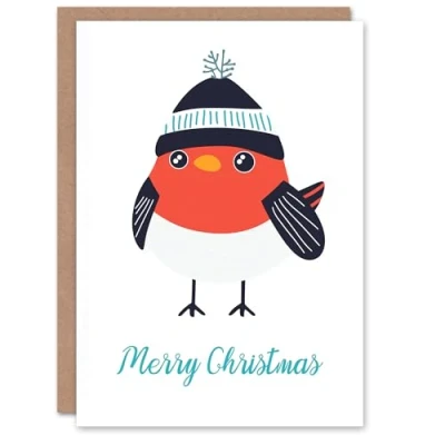 Artery8 Cute Robin Bird With Winter Hat Bright Modern Blank For Him Or Her Art Christmas Card