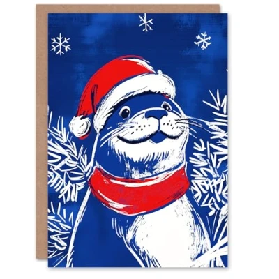 Artery8 Cute Seal Santa Hat Scarf White Blue For Child Kids Xmas Festive Christmas Card