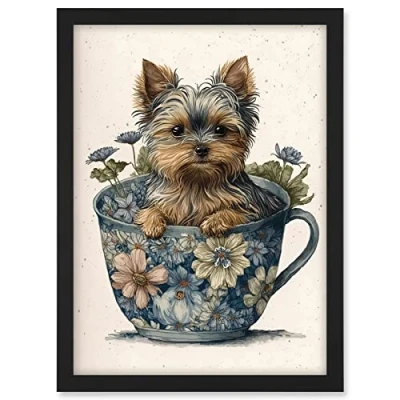 Artery8 Cute Teacup Yorkshire Terrier Dog and Flowers in Floral Tea Cup Modern Watercolour Illustration Artwork Framed A3 Wall Art Print