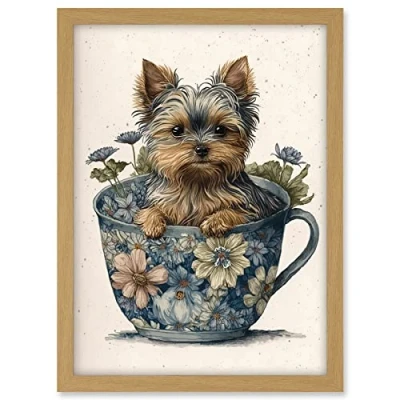 Artery8 Cute Teacup Yorkshire Terrier Dog and Flowers in Floral Tea Cup Modern Watercolour Illustration Artwork Framed A3 Wall Art Print