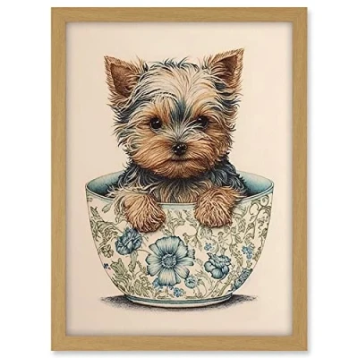 Artery8 Cute Teacup Yorkshire Terrier Dog in Floral Pattern Tea Cup Watercolour Illustration Artwork Framed A3 Wall Art Print