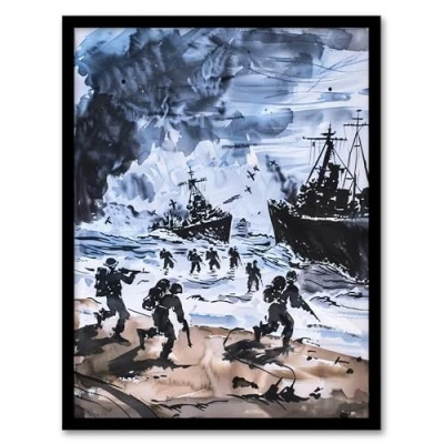 Artery8 D Day Normandy Landing 1944 WWII Watercolour Man Cave Artwork Framed Wall Art Print A4