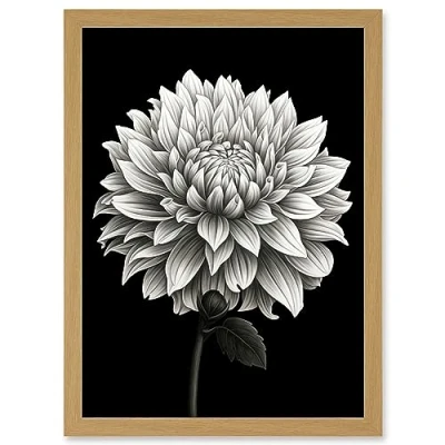 Artery8 Dahlia Flower Bloom White on Black Illustration Artwork Framed Wall Art Print A4