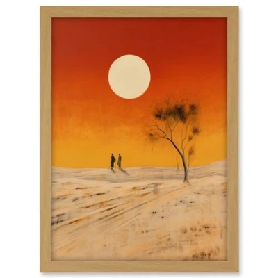 Artery8 Desert Landscape Sunset Sun Oil Painting Amber Orange Yellow Windswept Dunes Artwork Framed A3 Wall Art Print