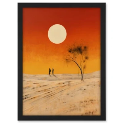 Artery8 Desert Landscape Sunset Sun Oil Painting Amber Orange Yellow Windswept Dunes Artwork Framed A3 Wall Art Print