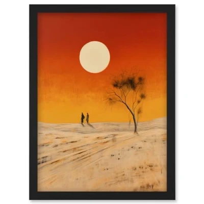 Artery8 Desert Landscape Sunset Sun Oil Painting Amber Orange Yellow Windswept Dunes Artwork Framed Wall Art Print A4