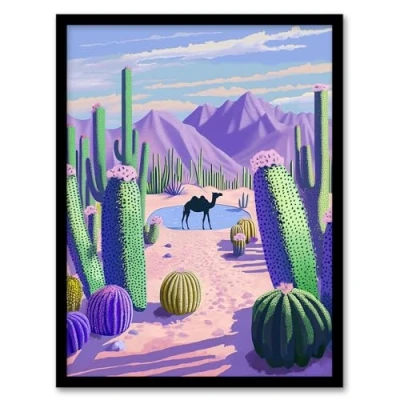 Artery8 Desert Oasis Cacti Camel Purple Green Landscape Living Room Artwork Framed Wall Art Print A4
