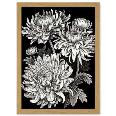 Artery8 Detailed Black and White Chrysanthemum Flowers Artwork Framed Wall Art Print A4
