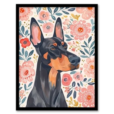Artery8 Dog Lover Doberman Portrait Pink Floral Folk Art Living Room Artwork Framed Wall Print A4