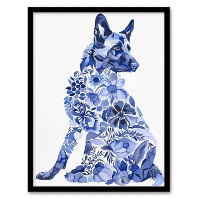 Artery8 Dog Lover Floral Alsatian Blue Watercolour Living Room Artwork Framed Wall Art Print A4