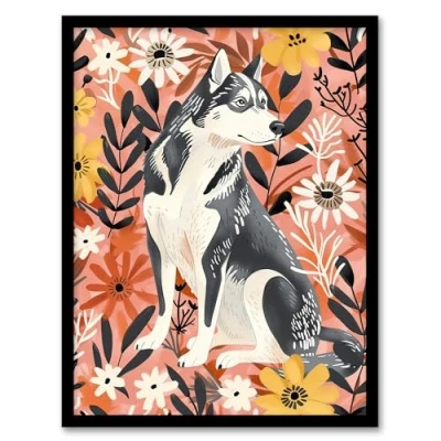 Artery8 Dog Lover Siberian Husky Rustic Pink Floral Living Room Artwork Framed Wall Art Print A4