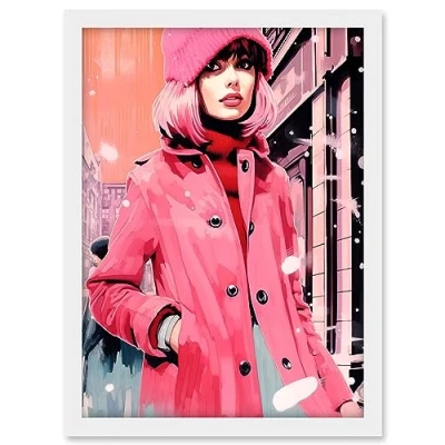 Artery8 Downtown Girl Woman in Retro Pink City Fashion Artwork Framed A3 Wall Art Print