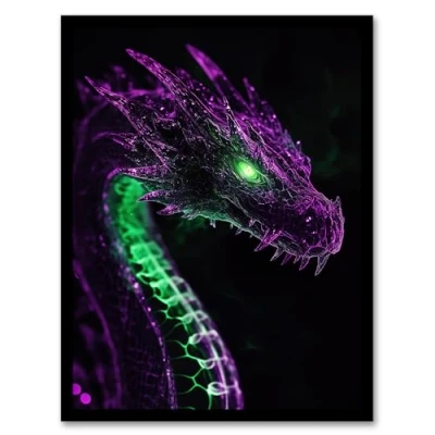 Artery8 Dragon Head Neon Purple Green Fantasy Concept Art Living Room Artwork Framed Wall Print A4