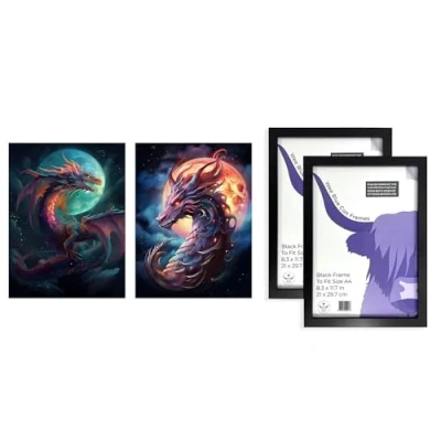 Artery8 Dragon Wall Art Set of 2 A4 Sized with Black Frames Moon Fantasy Mystical Serpent