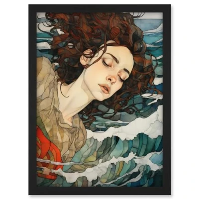 Artery8 Dreaming of the Sea Woman Sleeping Egon Schiele Style Watercolour Painting Red Brown Blue Carried by Waves Artwork Framed A3 Wall Art Print