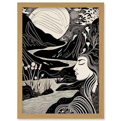Artery8 Earth Goddess River Mountain Landscape Linocut Artwork Framed Wall Art Print A4