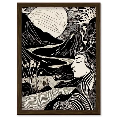 Artery8 Earth Goddess River Mountain Landscape Linocut Artwork Framed Wall Art Print A4