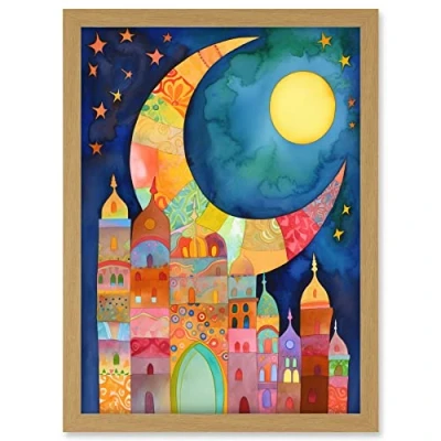 Artery8 Eid Crescent Moon Cityscape Folk Art Watercolour Painting Artwork Framed A3 Wall Print