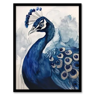 Artery8 Elegant Blue Peafowl Peacock Bird Watercolour Living Room Artwork Framed Wall Art Print A4