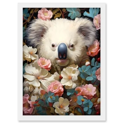 Artery8 Elegant White Koala Bear Nestled in Blue and Pink Blooming Flowers Floral Oil Painting Artwork Framed Wall Art Print A4