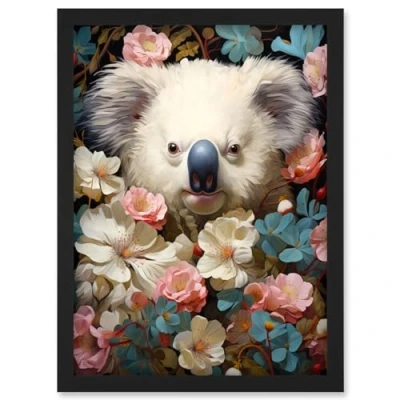 Artery8 Elegant White Koala Bear Nestled in Blue and Pink Blooming Flowers Floral Oil Painting Artwork Framed Wall Art Print A4