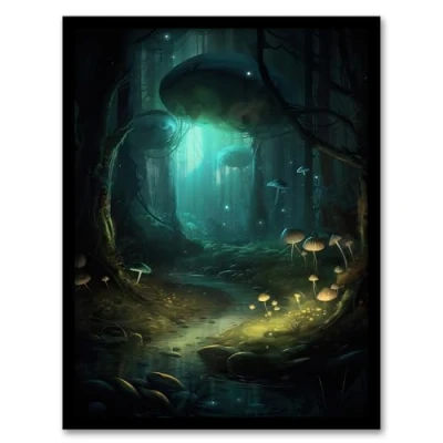 Artery8 Enchanted Forest With Bioluminescent Mushrooms Oil Painting Stream In Moonlit Fantasy Landscape Colourful Magical Nature Mystical Modern Artwork Framed Wall Art Print A4