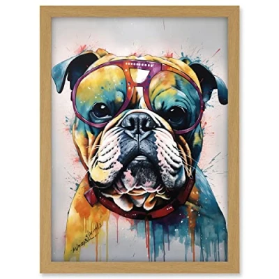 Artery8 English Bulldog Dog Wearing Vintage Sunglasses Artwork Framed A3 Wall Art Print