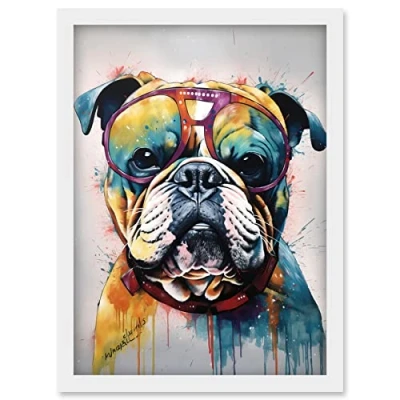 Artery8 English Bulldog Dog Wearing Vintage Sunglasses Artwork Framed Wall Art Print A4