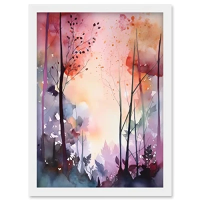 Artery8 Ethereal Misty Autumn Forest Landscape at Dawn Modern Watercolour Painting Artwork Framed Wall Art Print A4