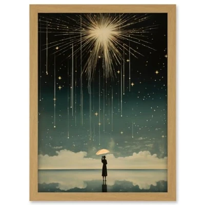 Artery8 Falling Star Rain Dreamy Artwork Bright Wish Woman with Umbrella Fairytale Dreamscape Framed A3 Wall Art Print