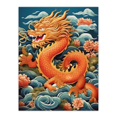 Artery8 Fantasy Chinese Dragon Traditional Orange Clouds 2024 Year Of The Extra Large XL Wall Art Poster Print