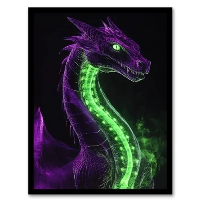 Artery8 Fantasy Dragon Neon Purple Green Xray Effect Living Room Artwork Framed Wall Art Print A4