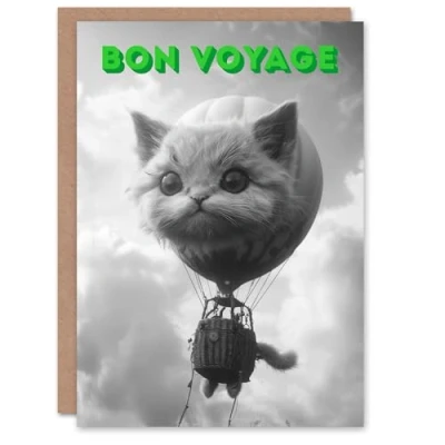 Artery8 Farewell Card Surreal Cat Lover Air Balloon Travel Bon Voyage Blank Arty Art All Occasion Greeting