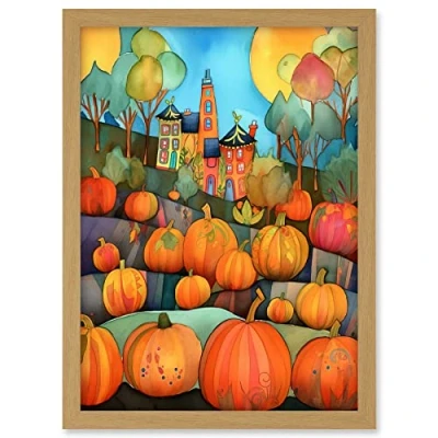 Artery8 Farm House Halloween Pumpkin Patch Modern Folk Art Watercolour Painting Artwork Framed A3 Wall Print