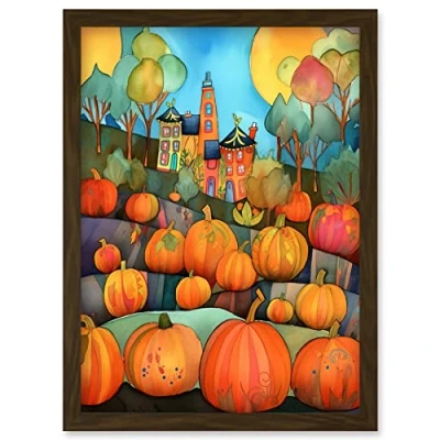 Artery8 Farm House Halloween Pumpkin Patch Modern Folk Art Watercolour Painting Artwork Framed Wall Print A4