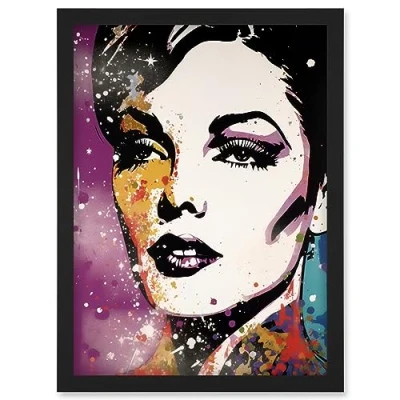 Artery8 Female Glam Rock Glitter Sparkle Purple Gold Blue Red Linocut Portrait Teen Room Artwork Framed Wall Art Print A4