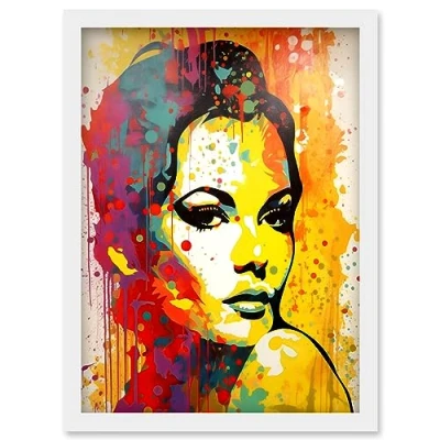 Artery8 Female Portrait Vibrant Modern Paint Bright Retro Glam Linocut Teen Room Artwork Framed Wall Art Print A4