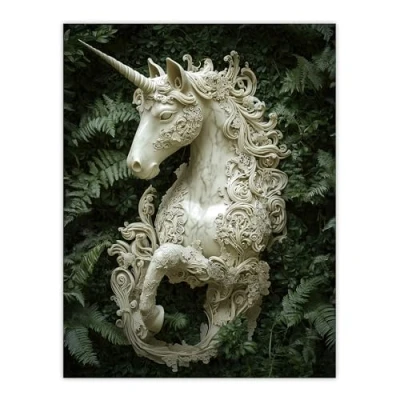 Artery8 Filigree Marble Unicorn Statue Fern Frond Leaves Living Room Extra Large XL Wall Art Poster Print